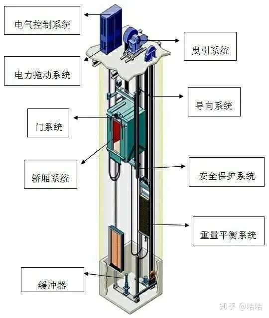一、曳引系統(tǒng):電梯曳系統(tǒng)的功能是輸出動(dòng)力和傳遞動(dòng)力,驅(qū)動(dòng)電梯運(yùn)行。主要由曳引機(jī),曳引鋼絲繩,導(dǎo)向輪和反繩輪組成。拽引機(jī)為電梯的運(yùn)行提供動(dòng)力,由電動(dòng)機(jī),拽引輪,連軸器,減速箱,和電磁制動(dòng)器組成。拽引鋼絲的兩端分別連轎廂和對重,依靠鋼絲繩和拽引輪之間的摩擦來驅(qū)動(dòng)轎廂升降。導(dǎo)向輪的作用是分開轎廂和對重的間距,采用復(fù)繞型還可以增加拽引力。